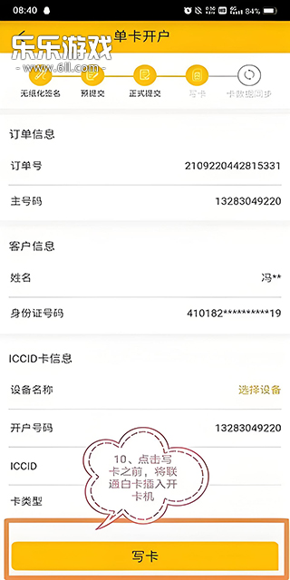 9、完成签名后,点击“写卡”,写卡之前,将联通白卡插入开卡机,注意不要插错。