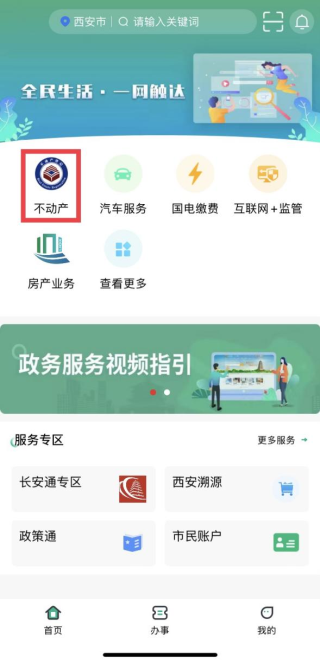 2、点击页面下方“办事”,切换服务地为西安市,部门分类选择市资源规划局→权利人查询。