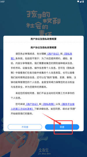 1、启动金苗宝应用,先在隐私政策页面点击同意按钮继续操作。