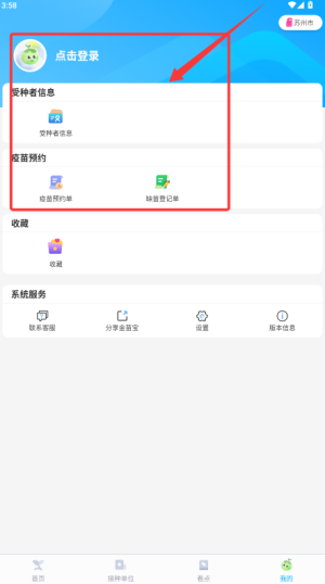 3、进入我的页面可进行登录或管理受种者及疫苗预约。