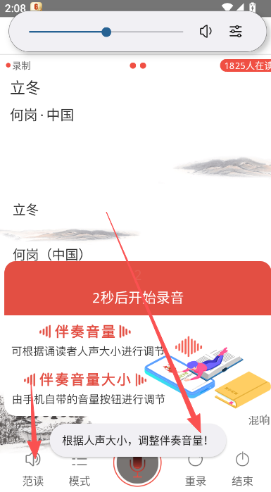4、依照范读的模板参与录音挑战,确保自己的录音环境干净,录出的效果是符合当前k诗主题的。