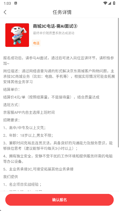 【多业务】目前支持电话和在线两种形式兼职方式,覆盖京东商城所有商品品类,服务每个商城的客户~