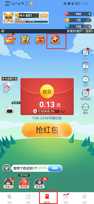 一、点击大乱斗-抽取-免费抽取,抽取游戏宠物,快速提升战力