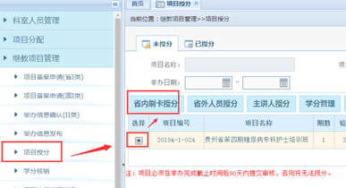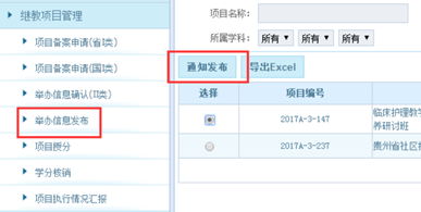 发布后本次项目的信息会公布到平台首页,方便贵州省内继教对象报名参加获取学分。(操作:继教项目管理—项目信息发布—选择要发布项目—通知发布)