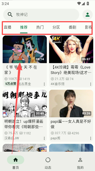 支持访问B站所有视频板块,包括番剧、UP主投稿和影视专栏等。