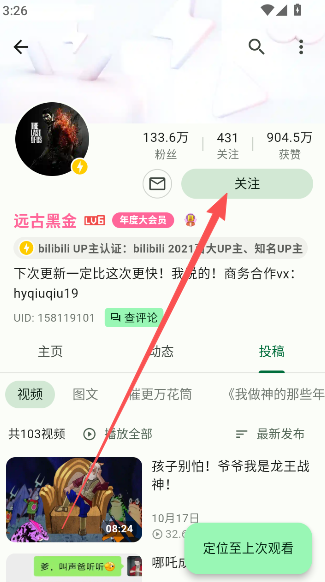 3、如果对up主用户制作的内容感兴趣的话,也是可以通过关注的方式,查看后续的动态内容发布哦。