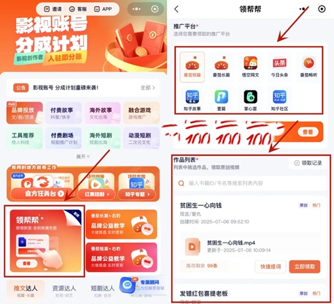 在右豹的首页,就可以看到领帮帮的入口,点击进去,就可以看到,这里面可以推荐的平台,以及可以申领原创视频的小说名称!