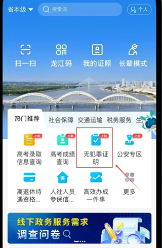 1、打开黑龙江“全省事”APP,在首页找到“无犯罪证明”,点击进入。