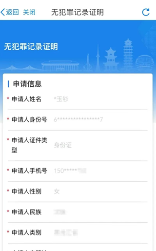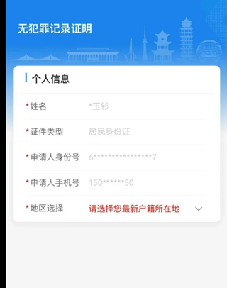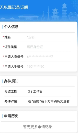 2、查询页面显示用户个人信息,点击下方“申请无犯罪记录证明”并进行人脸识别认证。
