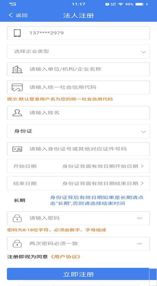 3、需要选择企业类型,填写企业名称、统一社会信用代码、法人真实姓名,法人身份证号码以及设置账号密码,确认填写信息无误后,点击"立即注册"按钮,进行法人账号注册,密码的填写需要符合输入框下方的提示要求,账号注进完成,可以在APP登录,进行业务办理。