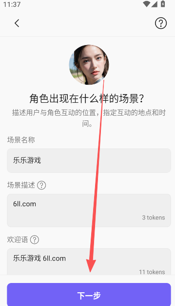 4、输入你要对话的场景名称、描述以及欢迎语等信息,完成后点击下一步。