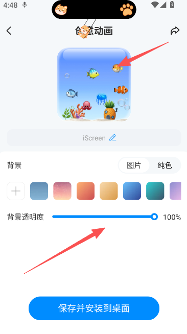 3、为了满足大家的透明背景设置需求,可在背景透明度直接降为0%,效果也就从刚才的完全展示变成了透明动画展示,非常的个性,确定请保存并安装到桌面,重启设备后生效。