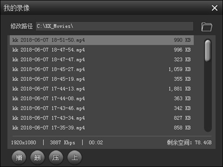 点击【我的录像】打开“我的录像”对话框,双击视频文件或选中文件再点击下方的播放按钮即可播放视频,点击右上方的打开按钮打开保存目录查看文件;点‘修改路径’可修改生成文件的保存路径。