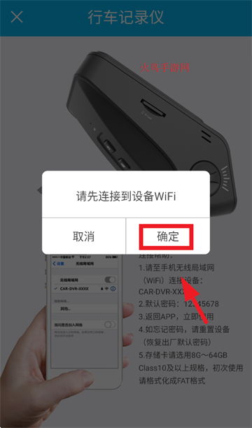 在请先连接到设备WiFi提示界面点击确定,跳转无线局域网(WiFi)连接设备:CAR-DVR-XXXX,默认密码:12345678,返回APP使用即可