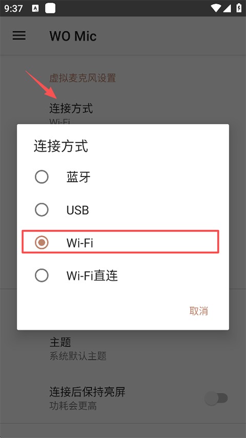 3、在设置界面中,找到并点击“连接方式”,然后选择“Wi-Fi”作为无线麦克风的主要传输渠道。