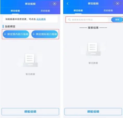 3、在搜索框内输入准备绑定的船舶名称进行检索,检索到船舶后输入船舶登记号进行绑定。注意:一艘船舶仅限一名法人用户绑定,如其他法人已绑定,则无法进行二次绑定。(船舶登记号可在《船舶所有权证书》中查看)