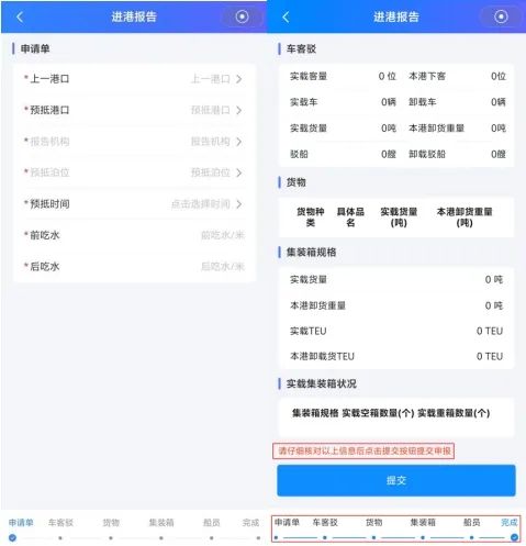 2、以申请“进港报告”为例(与视频演示“出港报告”相互补充),根据页面底端提示,结合船舶的实际情况依次完成“申请单-车客驳-货物-集装箱-船员”信息的填写,保存提交,即可完成申报。(页面中的*号为必填项目)