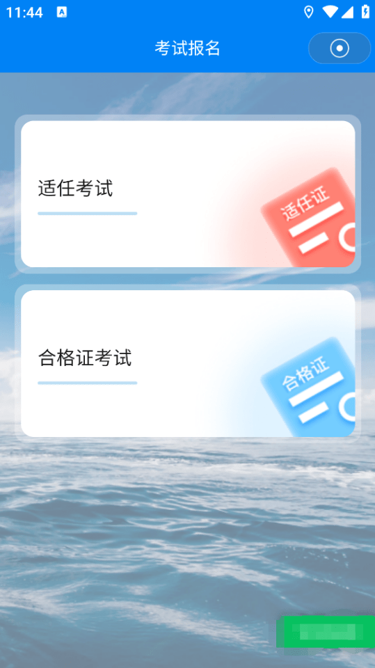 考生在办事页面点击“考试报名”,根据需要选择“适任证考试”报名或“合格证考试”报名。