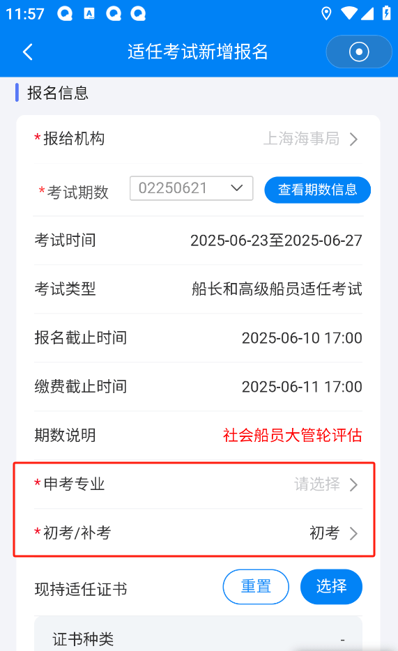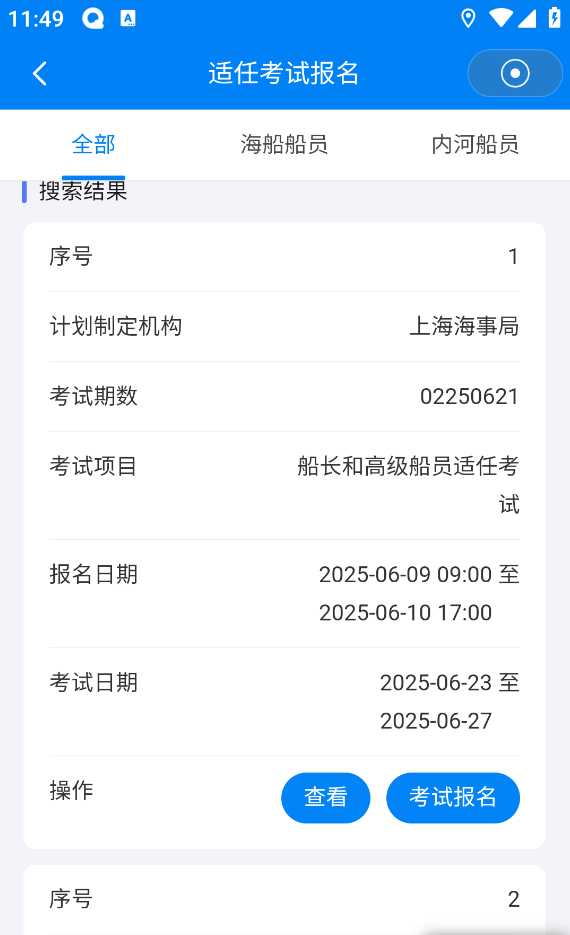 2.考试报名:考生在进入“船员服务”——“考试报名”功能后,选择报考类别(适任考试/合格证考试),查找考试期数信息,按要求填写、核对并提交报名信息。