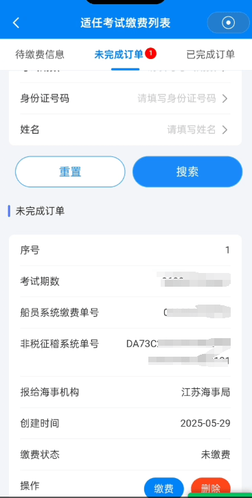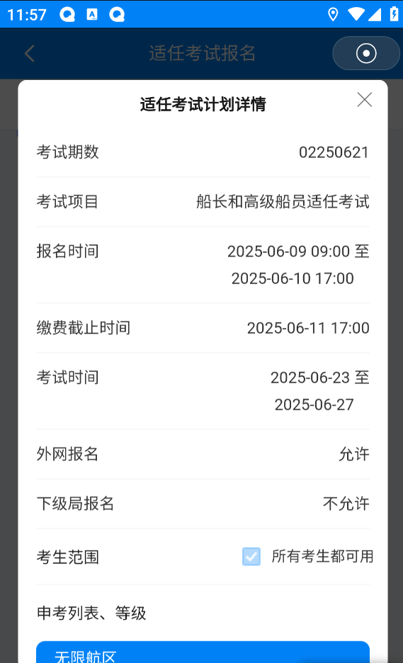 点击“适任考试”进入详情,共有“考试报名”“考试申报查询”“考试缴费”“考试通知书下载”“考试成绩查询”五个功能。需要报名的考生点击“考试报名”找到需要报名的对应期数,船员信息会自动带入详情。