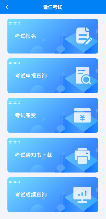 合格证考试与适任证考试类似,分为考试报名、考试申报查询、考试缴费、考试通知书下载、考试成绩查询五个模块。