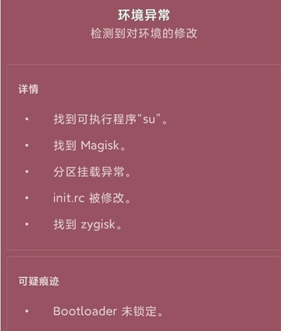 在我们通过牛头30这款检测工具时,检测到的环境问题点不仅仅是上方显示的,可能还有更多:[SElinux规则异常,允许了neverallow条目],[数据未加密,挂载参数被修改],[环境损坏/无响应],[init.rc被修改],[分区挂载异常],[包管理服务异常],[非SDK接口的限制失效]等。关于这些问题点如何解决?网上教程一大包,我这里就不过多阐述了。