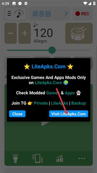 1、打开应用可能会弹出广告窗口,点击广告窗口右下角的Close按钮将其关闭,若误点VisitLiteApks.Com可能会跳转至广告页面返回即可,从而进入软件主要操作界面。