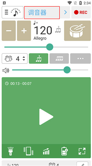 1、打开软件后为节拍器,点击上方“调音器”三个字进入调音器。