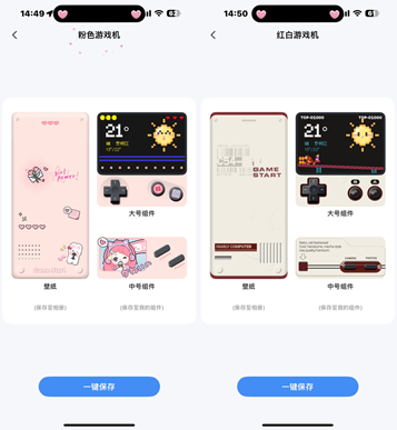 2、选择你喜欢的超级组件,这里就以游戏机的超级组件为例,选择一键使用,进入组件保存页面,点击“一键保存”按钮。(此时,图上的壁纸已经保存到你的手机相册了,图上的大号和中号组件也已经保存在APP-我的组件内)