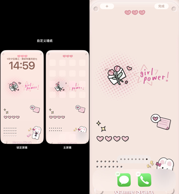3、回到锁屏页设置墙纸组合,设置墙纸的时候记得不要选择模糊效果噢。回到桌面长按主屏幕,直到出现左上角加号。