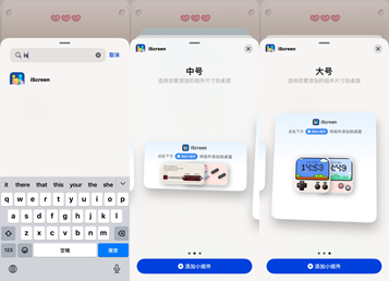 4、输入iScreen,然后点击搜索的内容,添加小组件