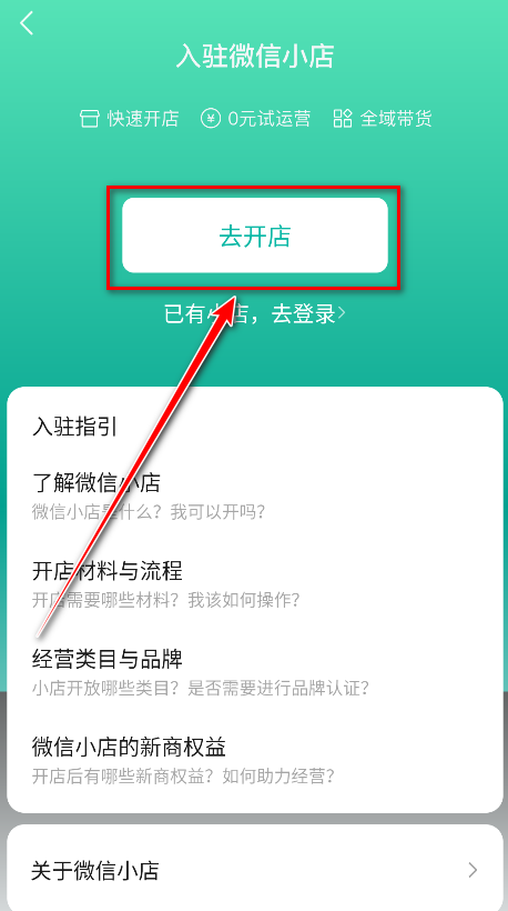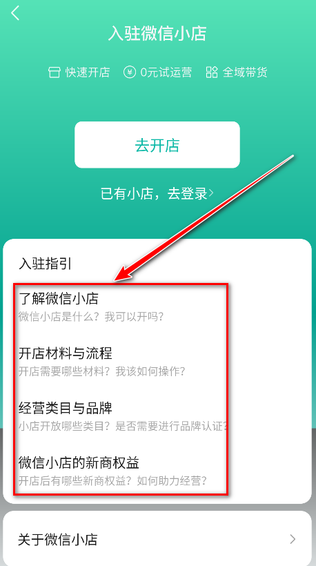 3.首先需要阅读入驻指引,主要是为了入驻顺利。入驻指引分为了解微信小店、开店材料与流程、经营类目与品牌、微信小店的新商权益。请大家一个个的仔细看完。