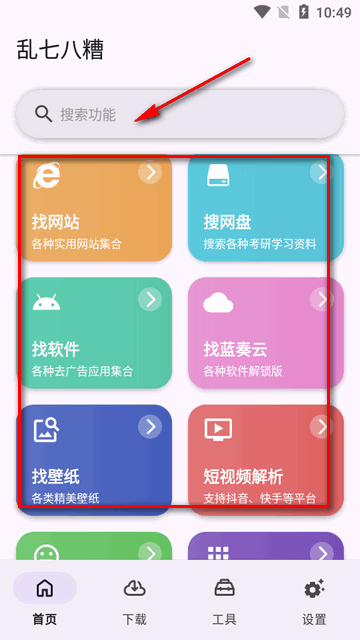 乱七八糟(com.all.inclusive)是一款聚合工具类软件,支持各种资源的搜索以及各种实用的小工具,是一款功能聚合型工具箱,集成了丰富的实用工具,涵盖图片处理、资源下载、便捷小工具等多种功能,几乎一应俱全。通过内置的海量工具,用户可以轻松实现多项任务,极大提升效率,你可以在这里自由的去选择需要的功能来进行使用哦!