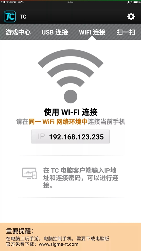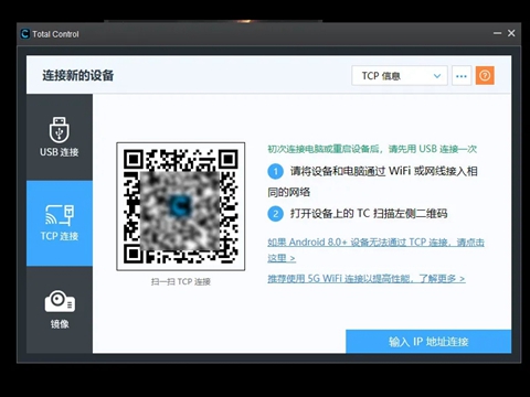 2、软件支持WIFI连接,但是需要电脑和手机处于同一个局域网。每次用WIFI连接之前需要用USB连接上电脑一下才行。在【连接新的设备】选择TCP连接,扫一扫就能用WIFI连接。