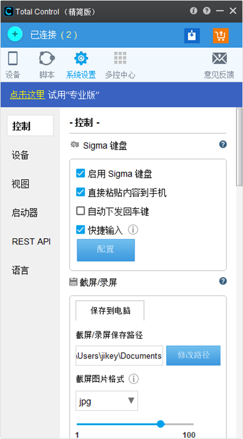 4、软件系统设置。可以设置截屏以及录屏保存路径、设置输入法、快捷输入、剪切板同步。