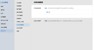 管理员支持设置可使用外部沟通的成员范围,范围内的成员可添加微信用户或企业外的企业微信用户为外部联系人。