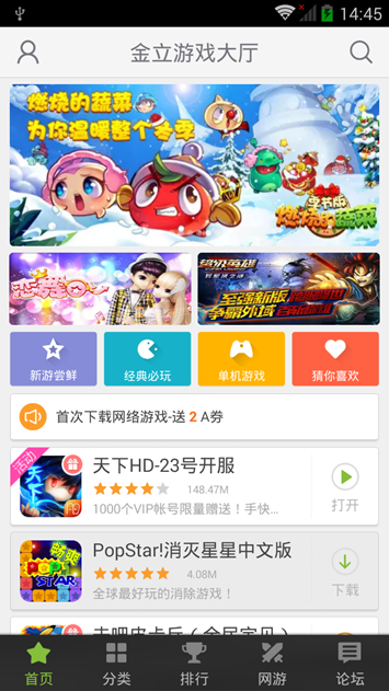 这又是一个让小编急不可耐的功能,终于可以在游戏大厅的论坛招摇我的游戏等级,终于可以光明正大查找游戏攻略和小伙伴们一起参与活动抢奖品了。下面就是点首页“论坛”按钮进入的页面,是不是很酷?!