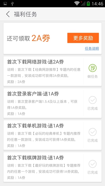 大家再仔细看看首页中间有个小喇叭,喊着“首次下载游戏-送2A券”,作为资深游戏玩家和小财迷的我果断点了进去,这就进入了任务系统界面,下面给大家介绍一下任务系统。