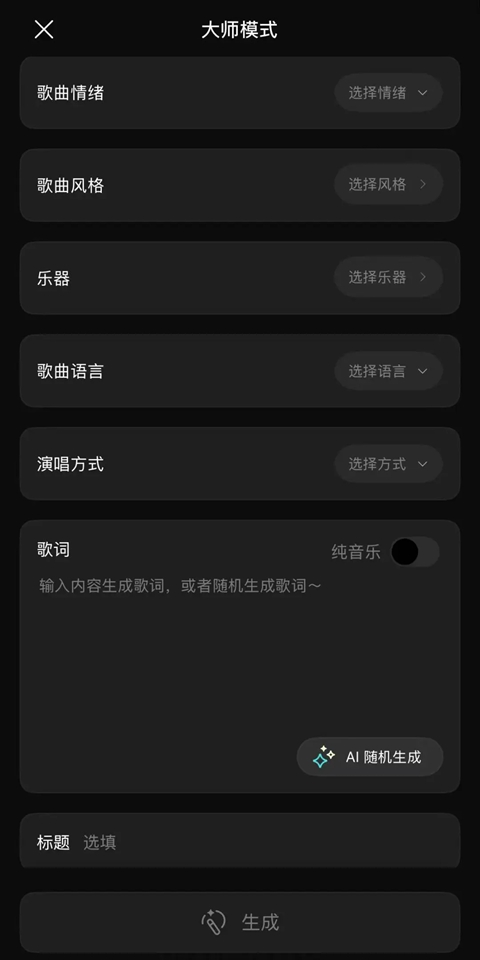 比如大师模式可以自定义歌曲的情绪、风格、乐器等等