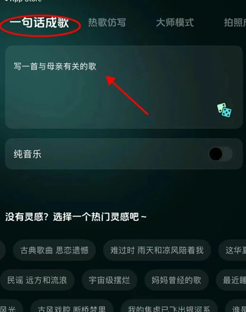 步骤二:点击“一句话成歌”,再到文本框输入你要生成的歌曲关键词,如:生成一首与母亲有关的歌曲,点击生成。