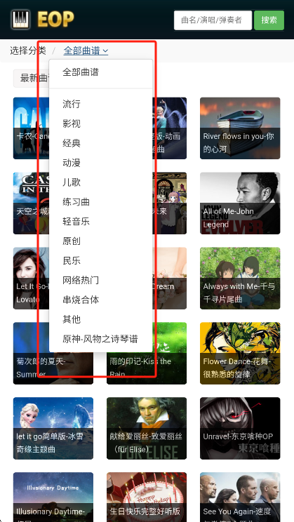 4、在上面也是给大家带来了众多分类选择的,相信一定有一款你想要弹奏的谱子