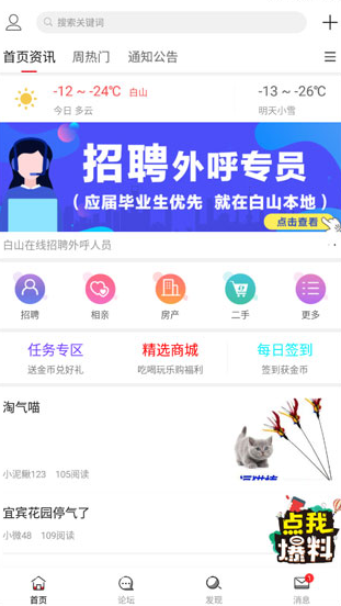 2、然后会看到首页、论坛、发现、消息四个板块,在首页中有着资讯、周热门、通知公告等服务,以及招聘、相亲、房产、二手、任务、商城、签到等功能;