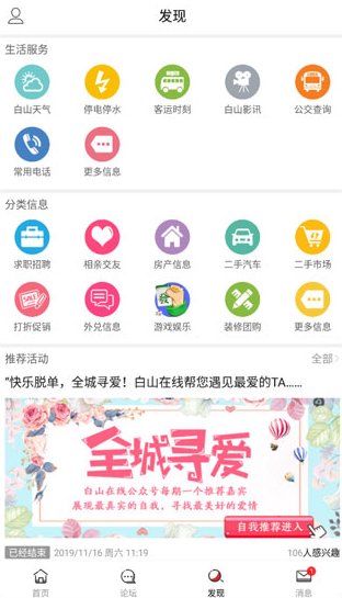 4、在发现中有着白山天气、停水停电、客运时刻、白山影讯、公交查询、常用电话等生活服务;拥有求职招聘、相亲交友、房产信息、二手汽车、二手市场、打折促销、游戏娱乐、外兑信息、装修团购等分类信息;还有大量推荐活动;