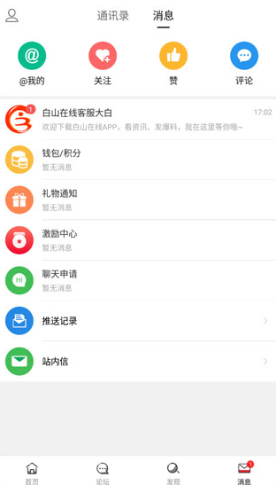 5、在消息中分为通讯录和消息两个模块,消息模块中有着白山在线客服大白、推送记录、站内信、激励中心、聊天申请、礼物通知、钱包/积分等功能。