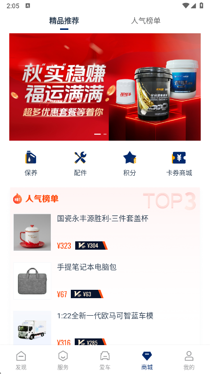 2、商城页面为我们提供了保养商城、热门配件、轮胎商城等方面的汽车用户交易服务,滑动至下方还可以查看更多商品。