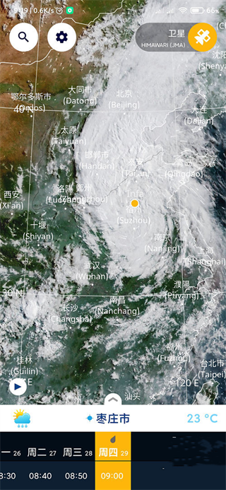 1、可以点击左上角的放大镜“搜索位置”按钮来查找。点击底部的“常州市”,会显示本地的详细天气预报、降水量、风向风力等信息,左右拖动时,上面卫星云图会随之变动。