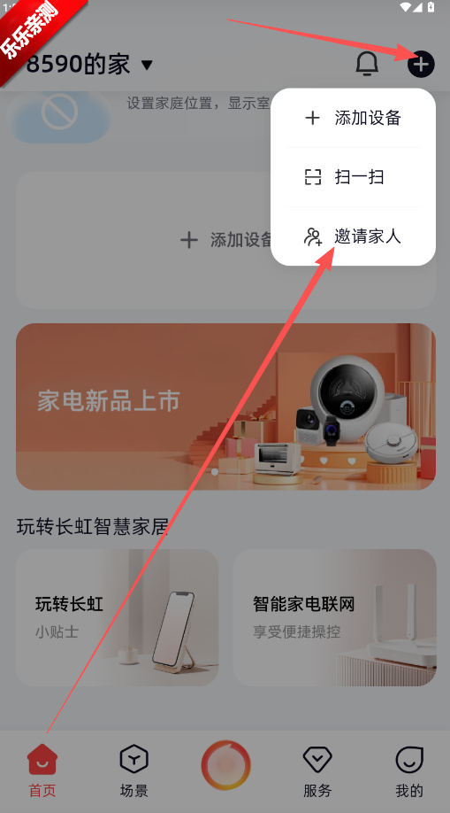 1、注册登录软件以后,打开首页,点击右上方的“+”号,在展开的列表中点击“邀请家人”。