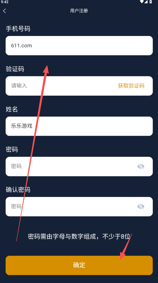 2、来到用户注册页面,点击输入:手机号码、短信验证码、姓名以及密码等信息,确认无信息遗漏后点击“确定”。