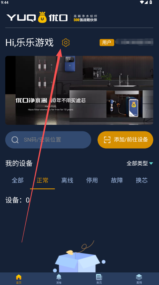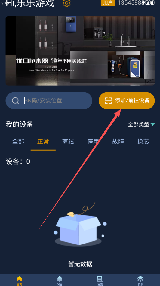 1、联网登录优口净水进入首页,点击“添加/前往设备”。