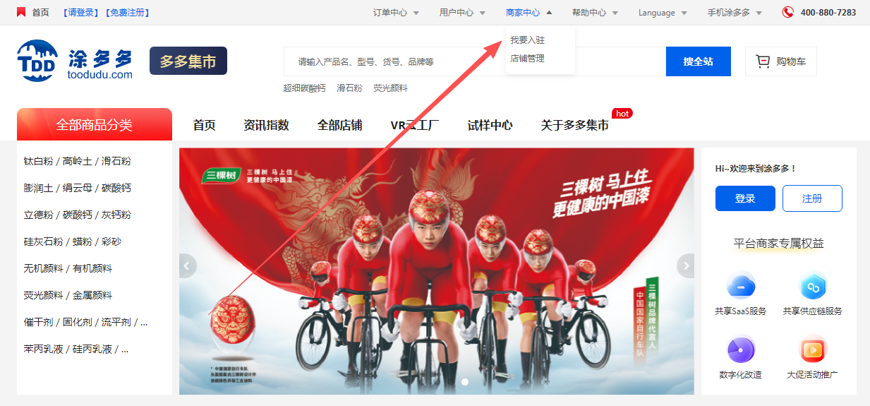1、登录凃多多在线网页,点击商家中心选择“我要入驻”。